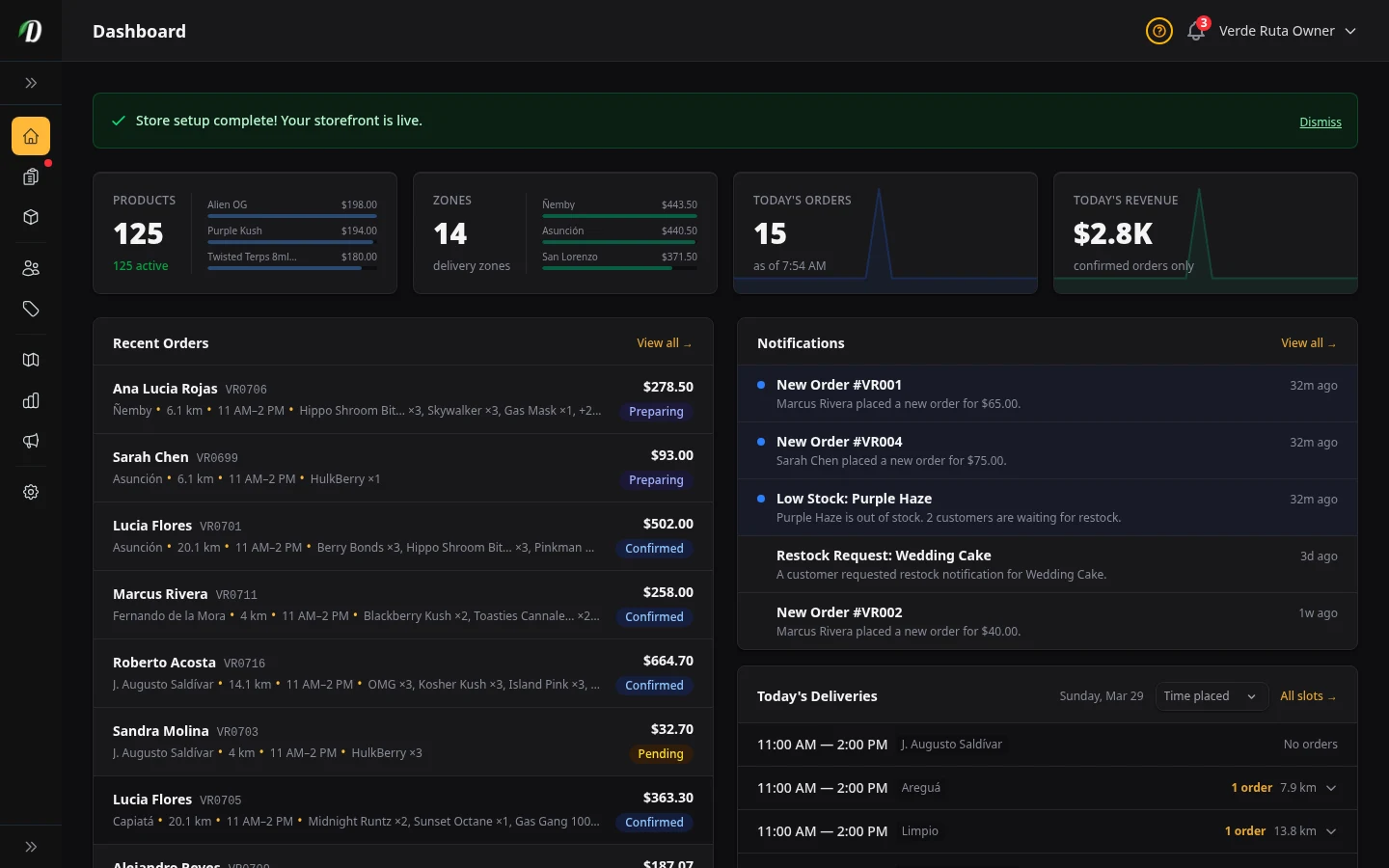 Launch your own branded cannabis delivery storefront in minutes. One-click delivery zone setup, real-time orders, inventory management, and built-in SEO for Google Search — everything you need to compete with the big dispensaries.